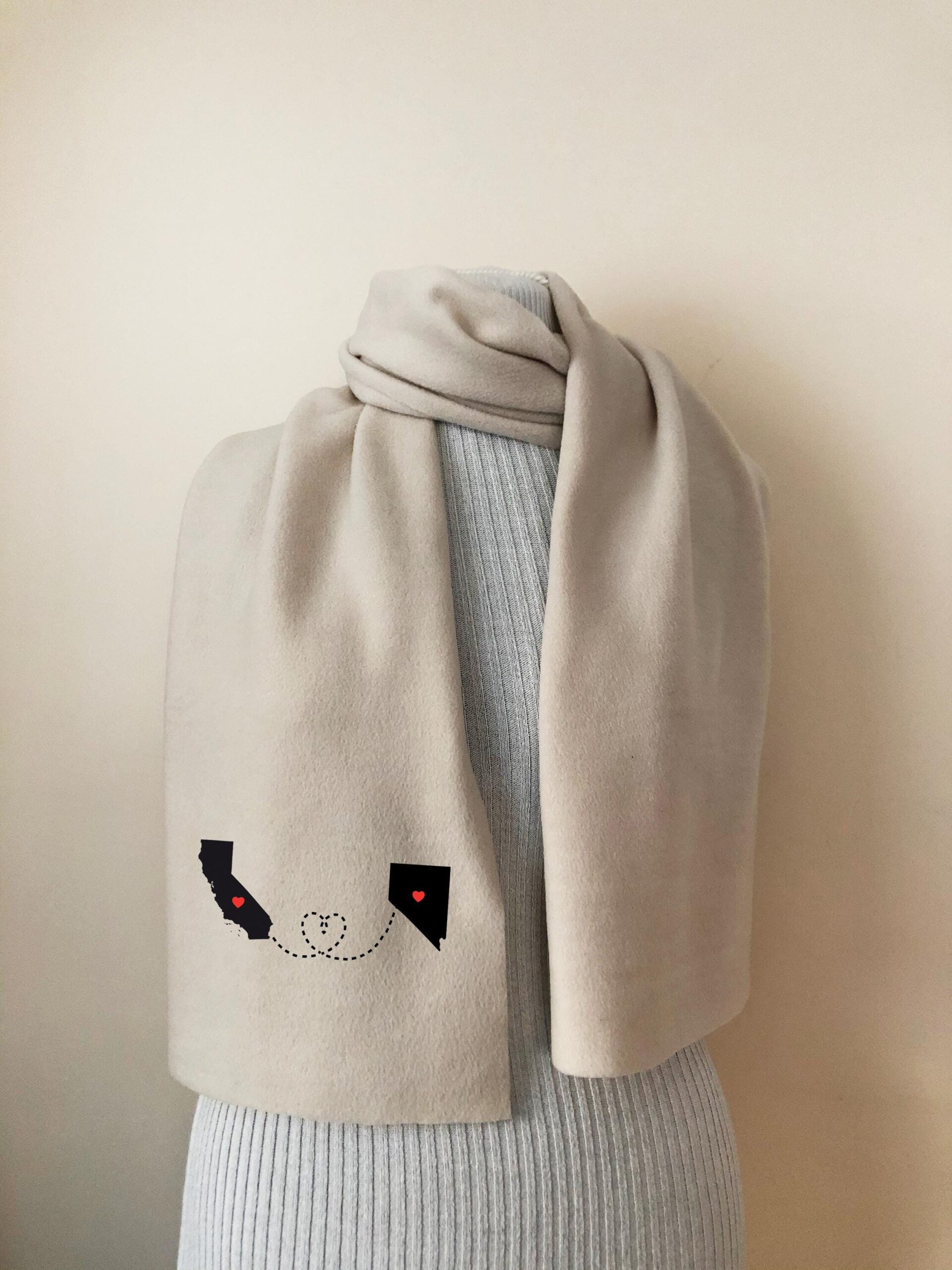Show your love across the miles with our Custom State Scarf, a heartfelt fleece gift featuring two U.S. states connected by a dotted heart trail—ideal for long distance relationships or best friend gifts.