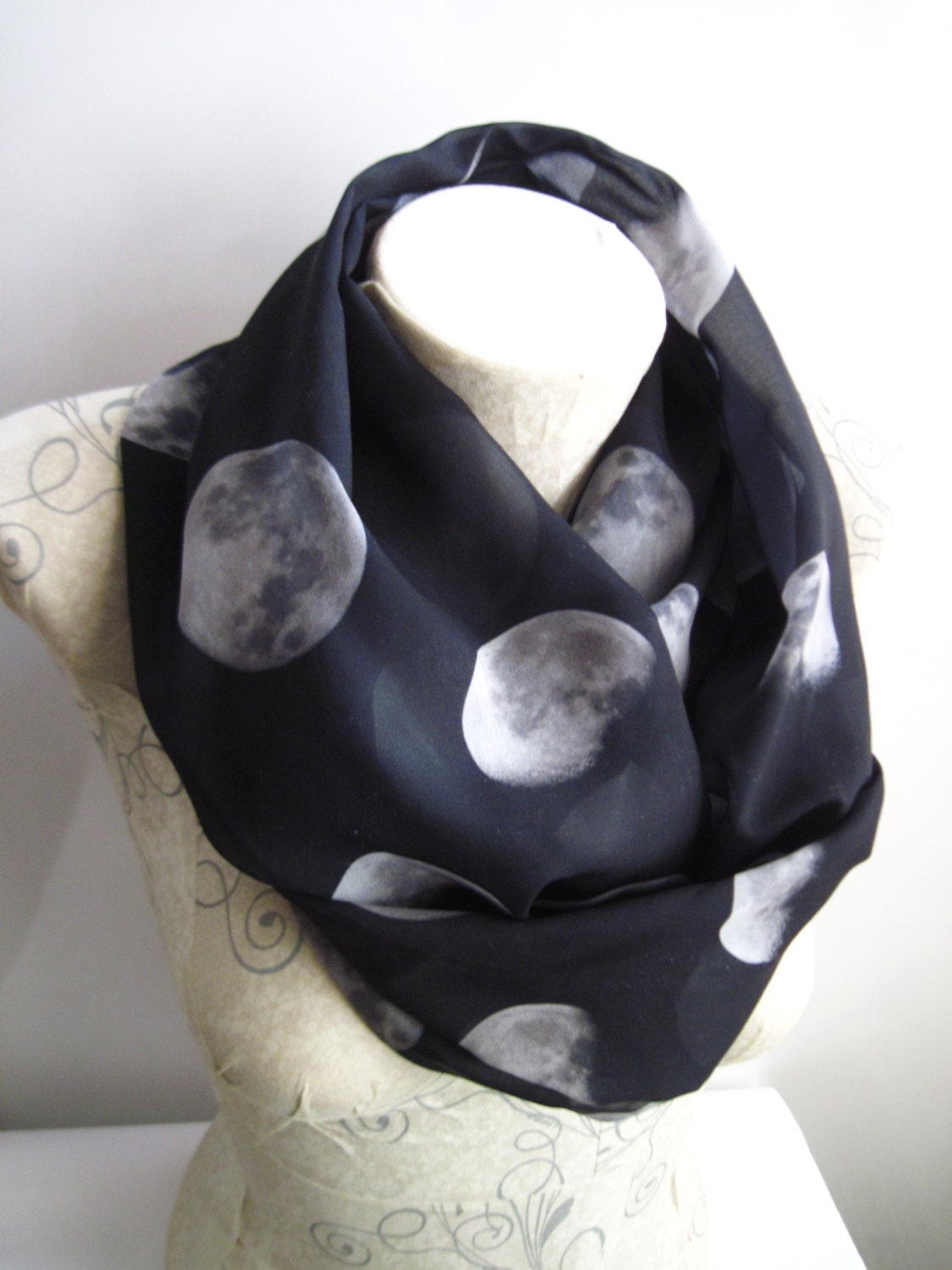 Moon Scarf lovers, rejoice! This stunning infinity scarf is designed for those who are enchanted by the night sky. Made from lightweight chiffon, it features beautifully detailed moon phases in grayscale on a black background—an ethereal touch to any outfit.